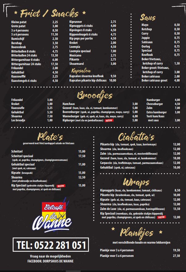 de Wanne is niet alleen dorpshuis, maar ook een gezellig eetcafé met terras waar U kunt genieten van koffie met gebak, een koel drankje of een lunch of diner.